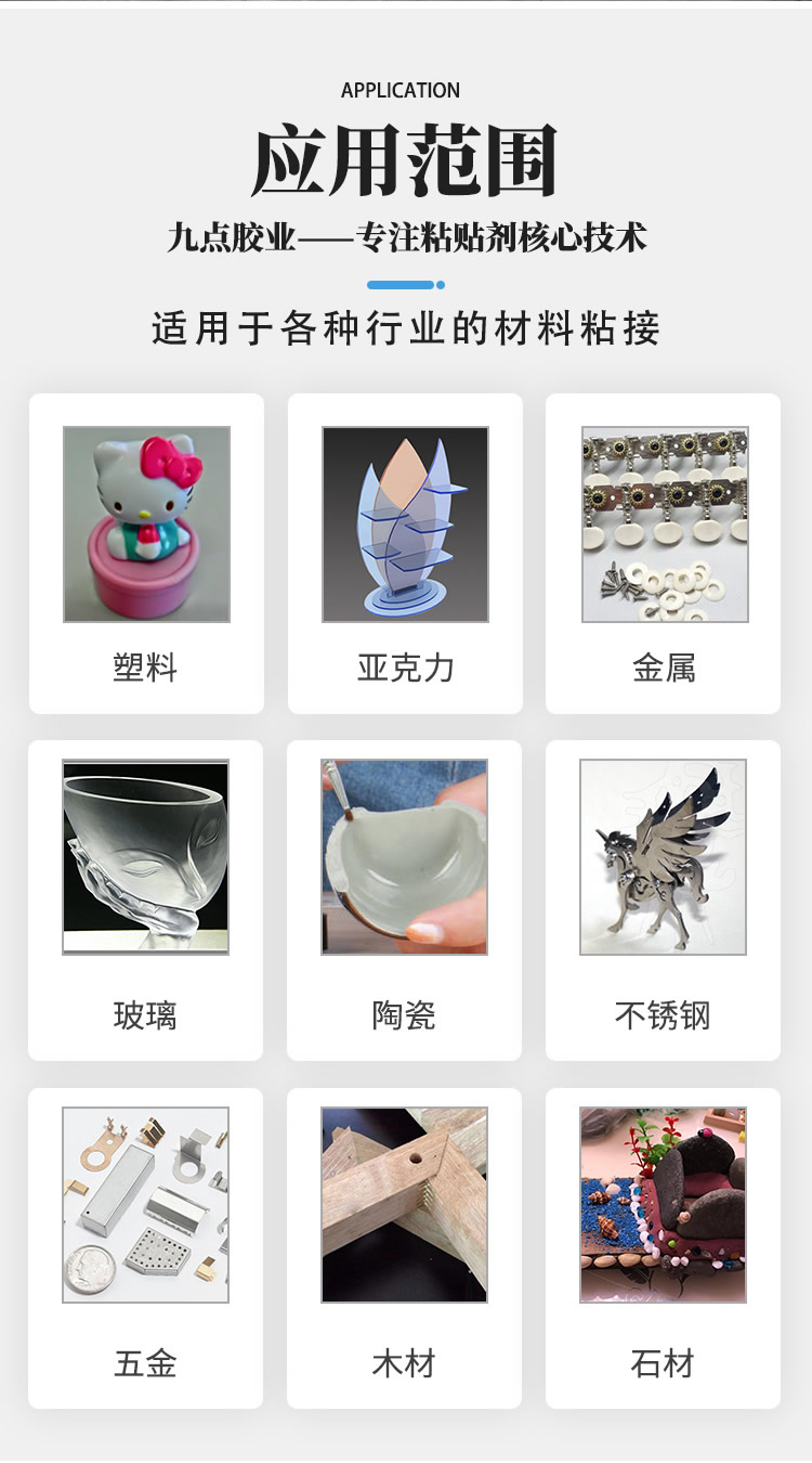 九點環(huán)保膠水適用于多種材料表面粘接效果更快、更明顯